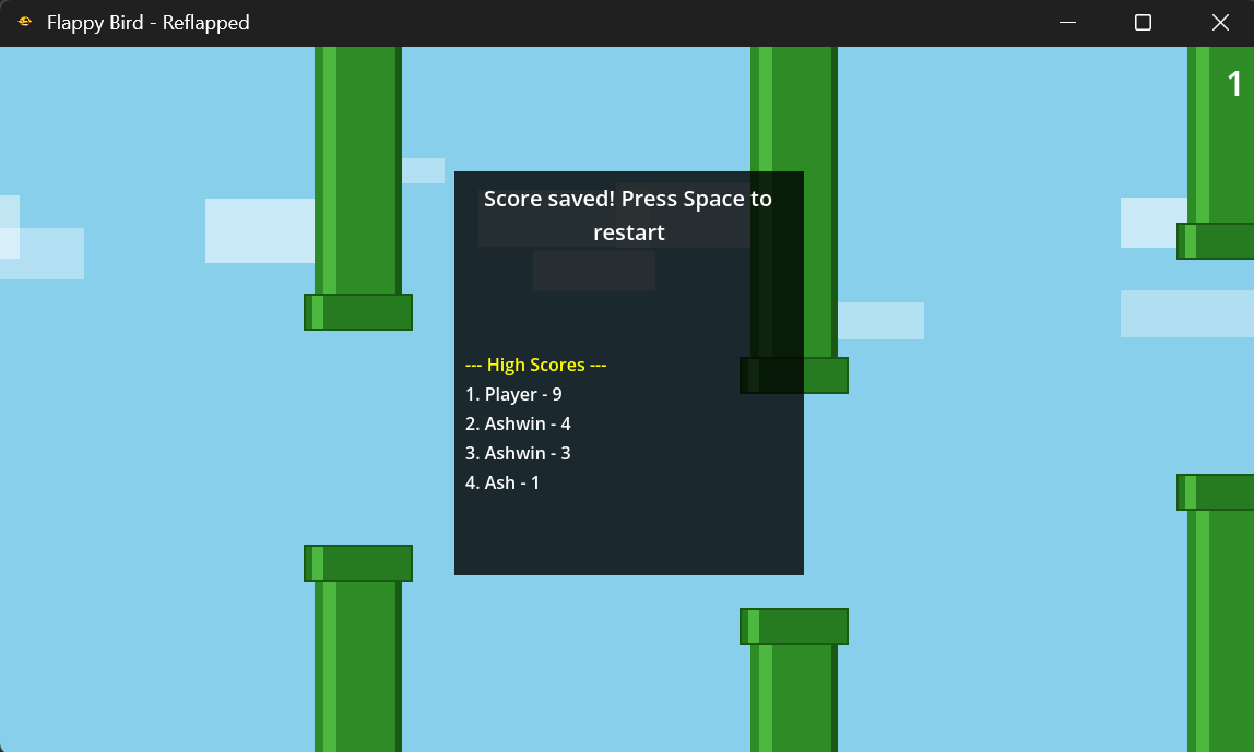 - Increasing difficulty — pipes get faster and gaps get tighter